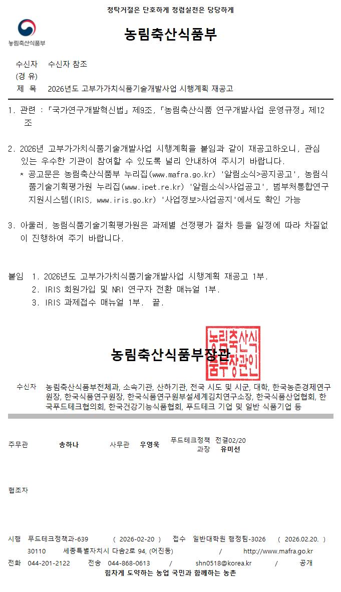 2026년도 고부가가치식품기술개발사업 시행계획 재공고
