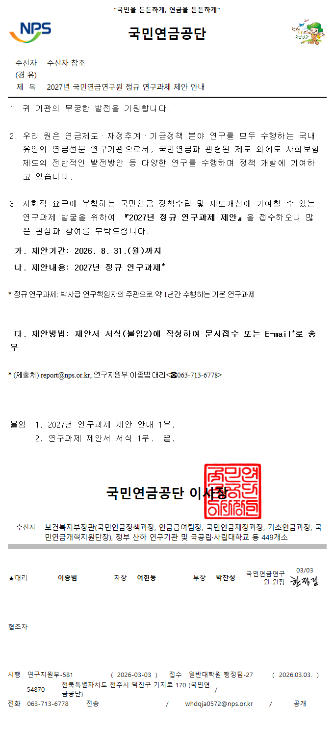 2027년 국민연금연구원 정규 연구과제 제안 안내